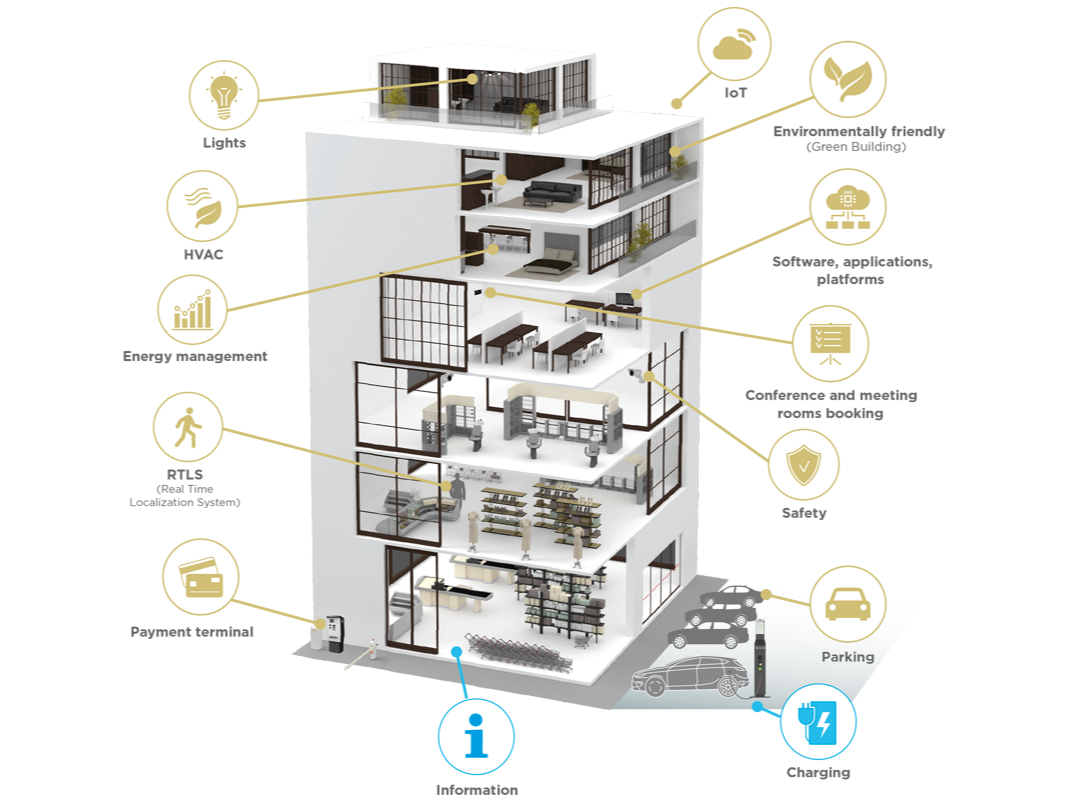 integrates various building systems, including HVAC, lighting, security, and fire safety, allowing for seamless operation and communication.